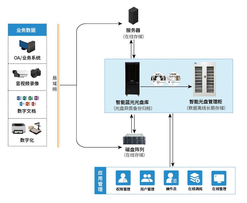 近线存储适用于需不定期访问的温数据,建议采用迪美视智能蓝光光盘库存储系统。光盘库支持与业务平台对接,具备定时定量备份、多任务分发、光盘批量回迁及日志追溯功能,自动生成光盘索引目录,实现在线调阅与快速检索。而且TB-PB级存储容量,满足海量档案存储之需。