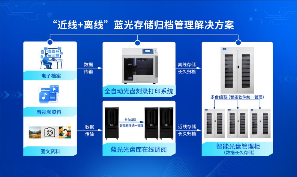 针对定期访问的“温热数据”,可采用蓝光光盘库管理系统进行刻录存储。该系统提供TB级至PB级的存储容量,系统能自动将光盘内容回读至硬盘保存,支持在线存储与智能检索,既保障数据安全保存,又能有效降低运维成本与安全风险。