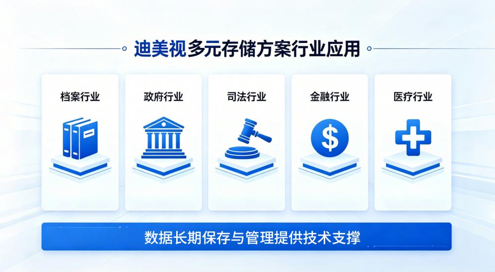 目前,迪美视多元存储方案已广泛应用于档案、政府、司法、金融、医疗等行业,为数据长期保存与管理提供技术支撑,助力用户应对大数据时代的数据存储挑战。